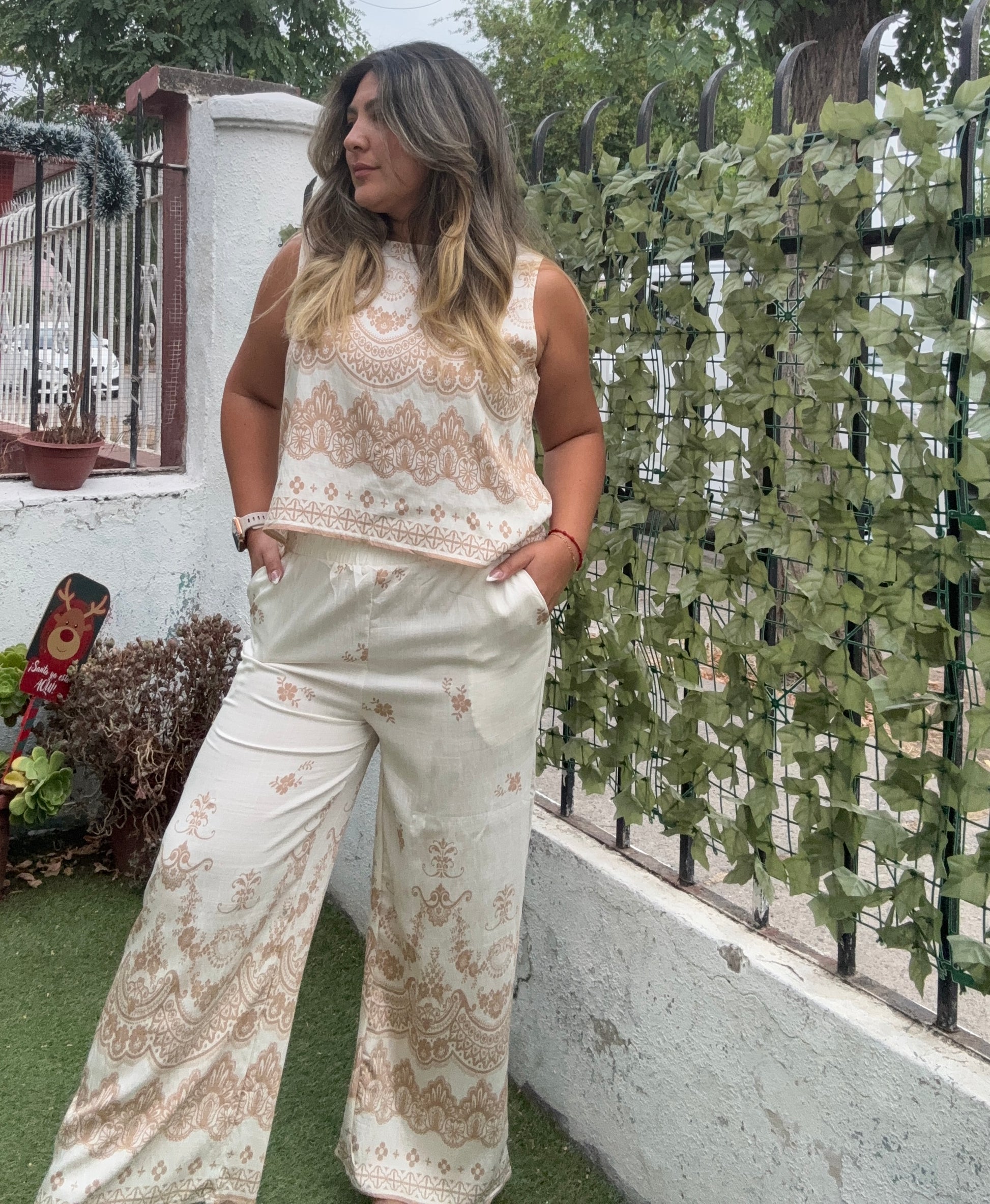 El conjunto incluye una blusa sin mangas de corte recto , que aporta comodidad y libertad de movimiento, y un pantalón palazzo de tiro medio con bolsillos laterales , que estiliza la figura y brinda un look moderno y relajado. Su estampado ornamental contrasta con el toque boho-elegante, fácil de combinar con sandalias, zapatillas o accesorios más atractivos.