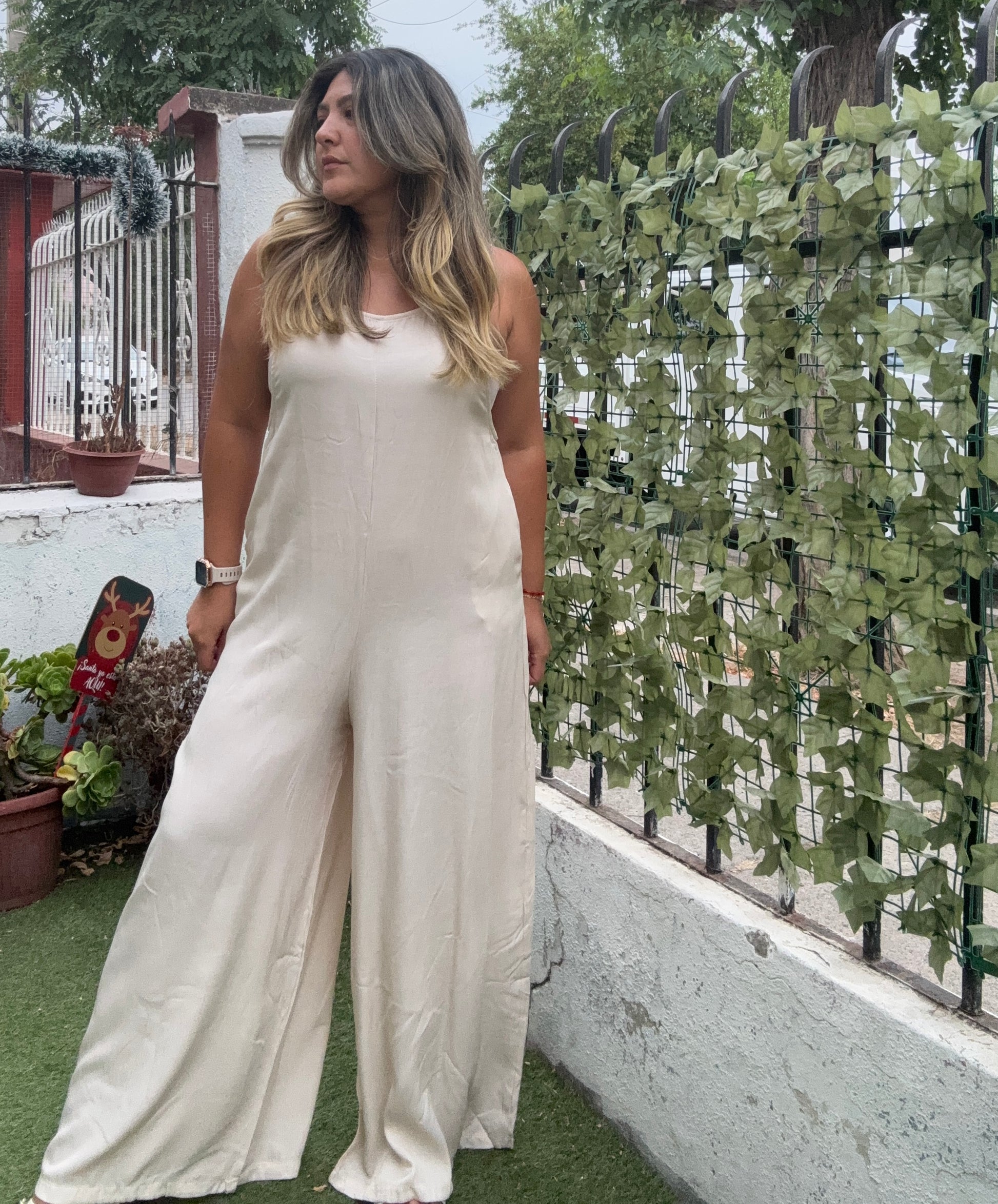 Su diseño sin mangas, de corte amplio y relajado, lo convierte en una opción ideal para climas cálidos. El pantalón palazzo de pierna ancha aporta un estilo moderno y sofisticado, adaptándose fácilmente a distintos tipos de cuerpo.